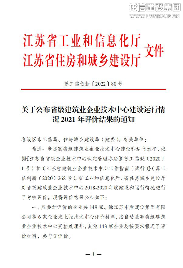 近日,江蘇省工業(yè)和信息化廳、江蘇省住房和城鄉(xiāng)建設廳印發(fā)《關(guān)于公布省級建筑業(yè)企業(yè)技術(shù)中心建設運行情況2021年評價結(jié)果的通知》(蘇工信創(chuàng)新〔2022〕80號),龍信集團獲2021年江蘇省建筑業(yè)企業(yè)技術(shù)中心“考核優(yōu)秀”的評定。本次共有149家企業(yè)參評,15家企業(yè)技術(shù)中心評價結(jié)果為優(yōu)秀。