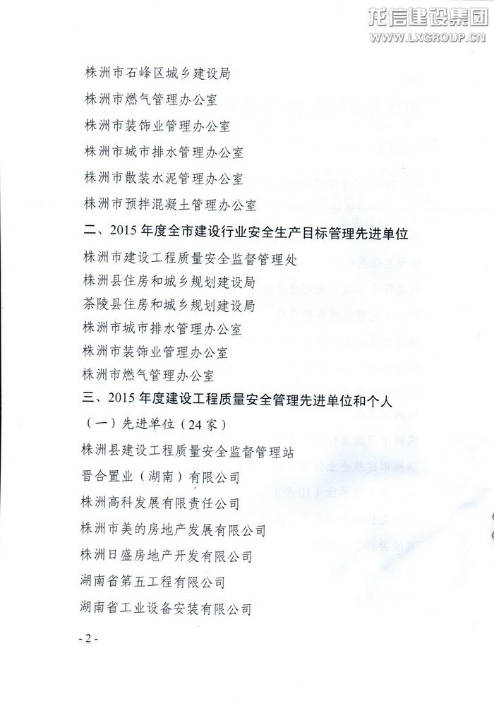 近日收到株洲市住房和城鄉建設局株建發[2016]2號文,關于表彰2015年度住房和城鄉建設系統工作管理目標先進單位和個人決定,由我公司承建的晉合湘水灣項目部獲2015年建設工程質量安全管理先進單位,工程建設方晉合置業(湖南)有限公司亦獲得2015年建設工程質量安全管理先進單位。此次獲獎是繼株洲晉合湘水灣一期高層4#、5#、6#樓被湖南省住建廳、湖南省建筑業協會評為“2013—2014年度第二批湖南省優質工程”后又一重要獎項。