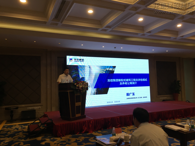 6月14日上午,會議由中國土木工程學會住宅工程指導工作委員會理事長張軍主持。郭允沖部長致辭并分析了國內外裝配式建筑的現狀和未來發展方向。王華理事長對裝配式建筑的發展歷程和技術體系做了深入分析。龍信集團總工程師殷廣玉作了題為“龍信集團裝配式建筑與養老住宅介紹”的匯報,詳細介紹了龍信產業化發展歷程和技術優勢,并就南通人才公寓項目和海門樂頤薈老年公寓項目為實例講述了龍信集團裝配式剪力墻及框架結構設計、施工的先進性并介紹了龍信老年公寓讓老者“養、尊、處、優”的社區養老運營模式。